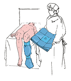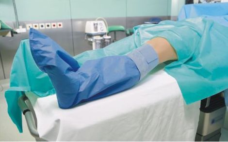 Rozłóż serwetę w górę ciała pacjenta przekładając nogę w pokrowcu przez elastyczne otwory. Umocuj dolny otwór tuż pod kolanem tak by kolano znalazło się między otworami.