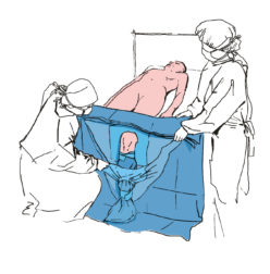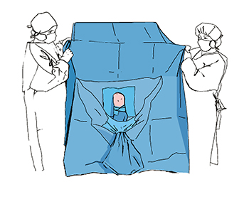 Rozłóż pozostałą część serwety przykrywając całego pacjenta. Od strony głowy umocuj serwetę do ekranu anestezjologicznego za pomocą przylepców na rogach serwety.