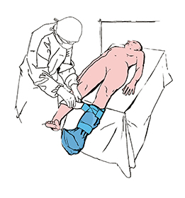 Załóż pokrowiec na nogę pacjenta i umocuj go pod kolanem taśmami samoprzylepnymi.