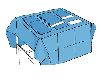 Po otwarciu opakowania połóż obłożenie na stole do instrumentarium. Zewnętrzną serwetą zabezpiecz stół oraz pozostałe elementy. Rozłóż elementy na stole i zwróć uwagę na piktogramy na serwetach oznaczające miejsce aplikacji.
