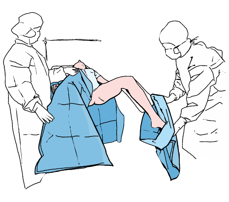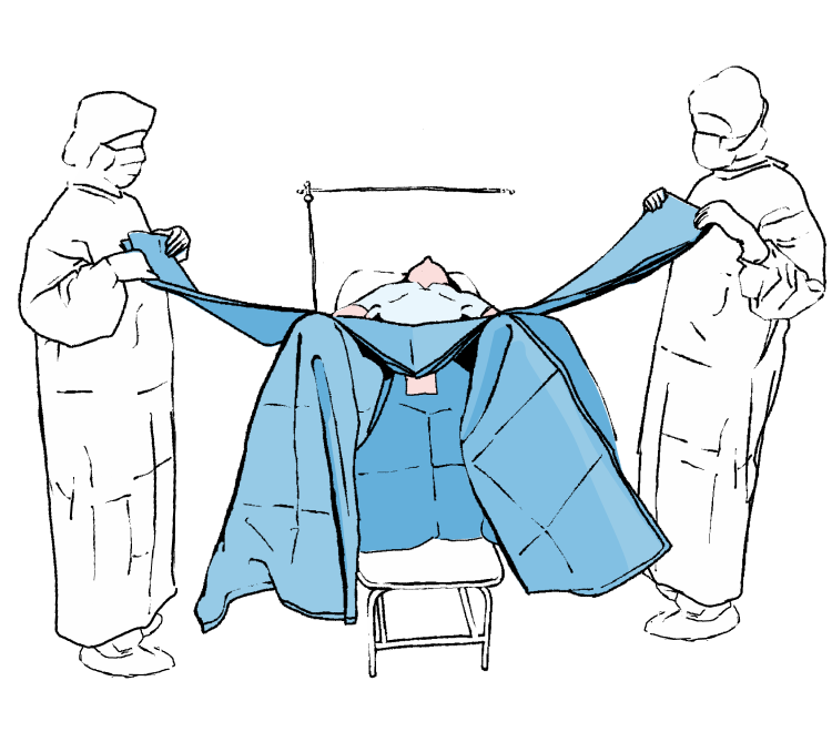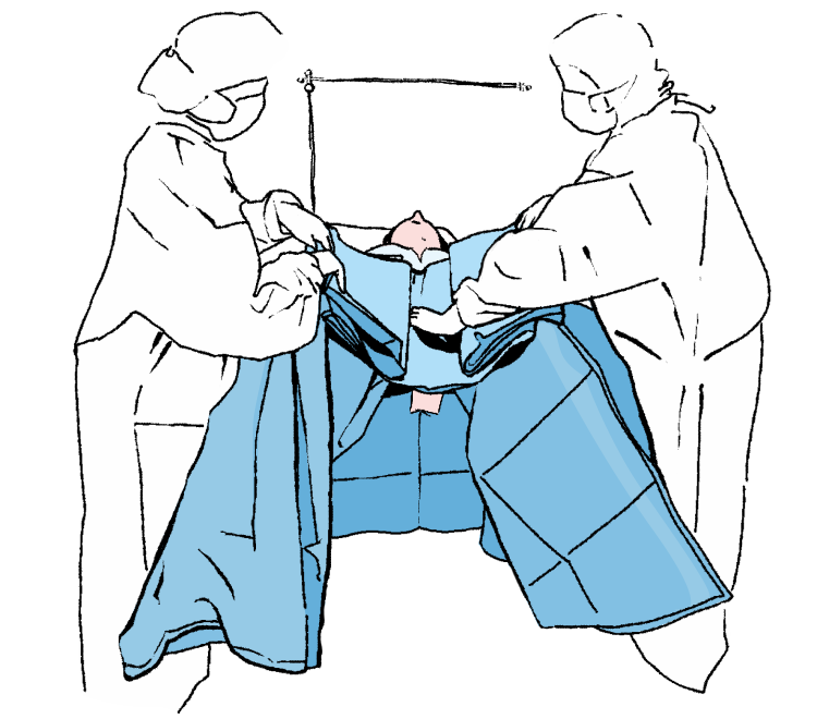Rozwinąć boki obłożenia tak by swobodnie zwisały ze stołu operacyjnego, a następnie rozwinąć górną część obłożenia w kierunku głowy pacjentki (w kierunku stanowiska anestezjologicznego).