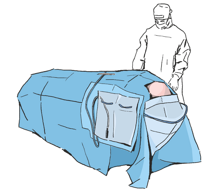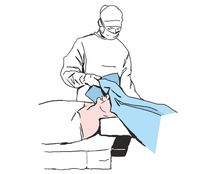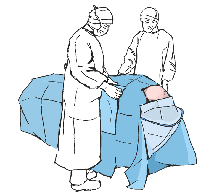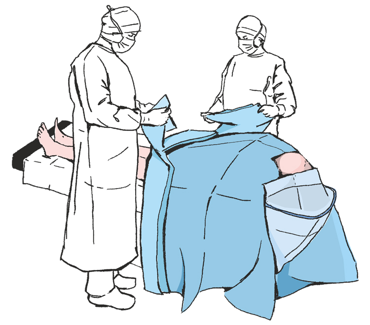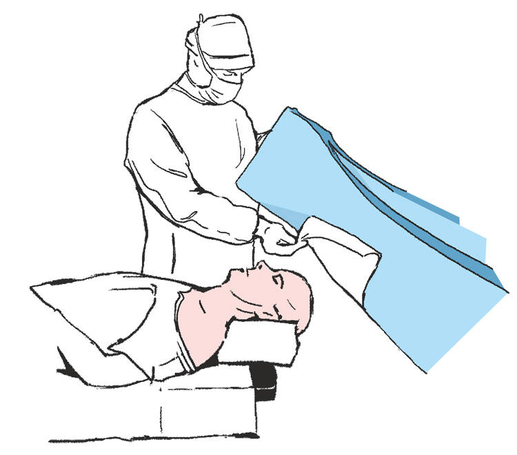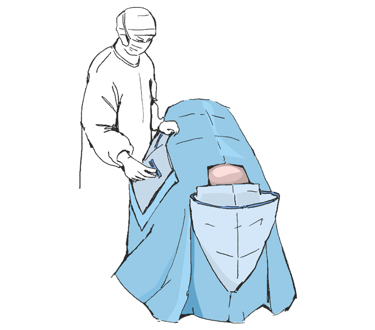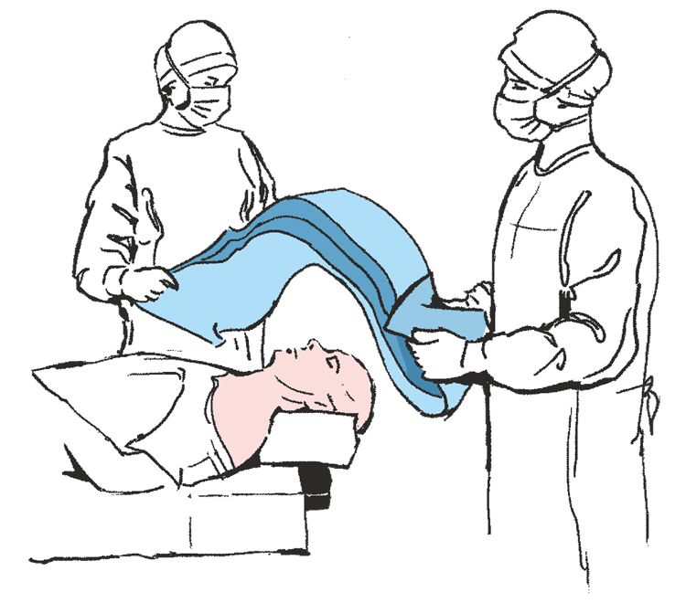 Rozwinąć nad głową pacjenta boki obłożenia w 2 osoby tak by swobodnie zwisały ze stołu operacyjnego ...