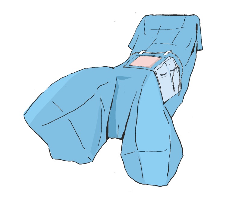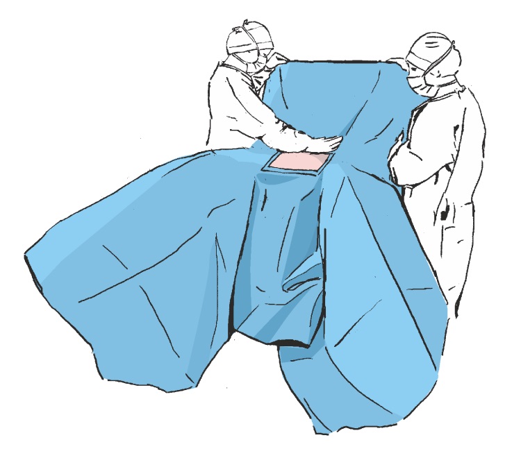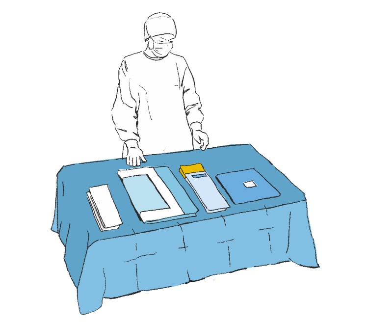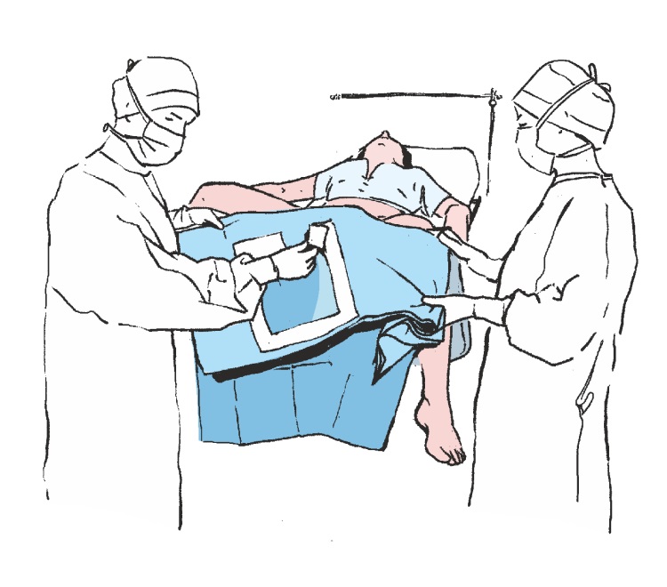 Nasunąć nogawice na nogi pacjenta i przykleić obłożenie do brzucha pacjenta wyznaczając tym samym pole operacyjne. Następnie docisnąć w miejscu przyklejenia obłożenia w celu zwiększenia przyczepności taśmy przylepnej do skóry pacjenta.