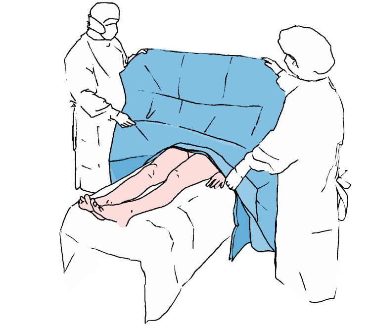 Rozwinąć dolną część obłożenia w kierunku dolnego krańca stołu operacyjnego zabezpieczając kończyny dolne pacjenta.