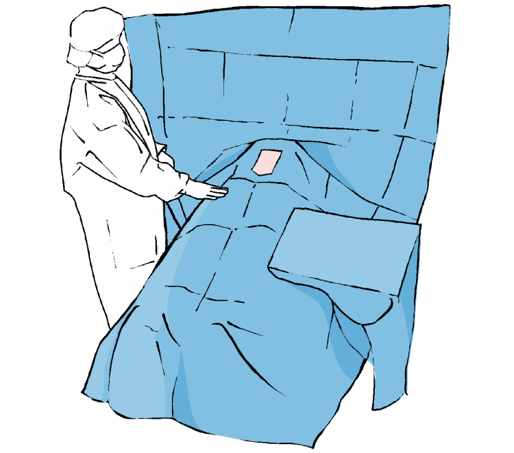 Usunąć papier zabezpieczający z otworu serwety głównej i przykleić obłożenie wyznaczając tym samym pole operacyjne. Następnie docisnąć w miejscu przyklejenia obłożenia w celu zwiększenia przyczepności taśmy przylepnej do skóry pacjenta.