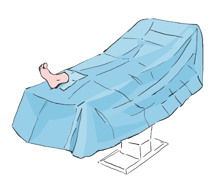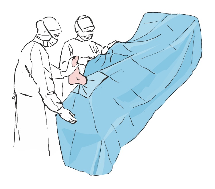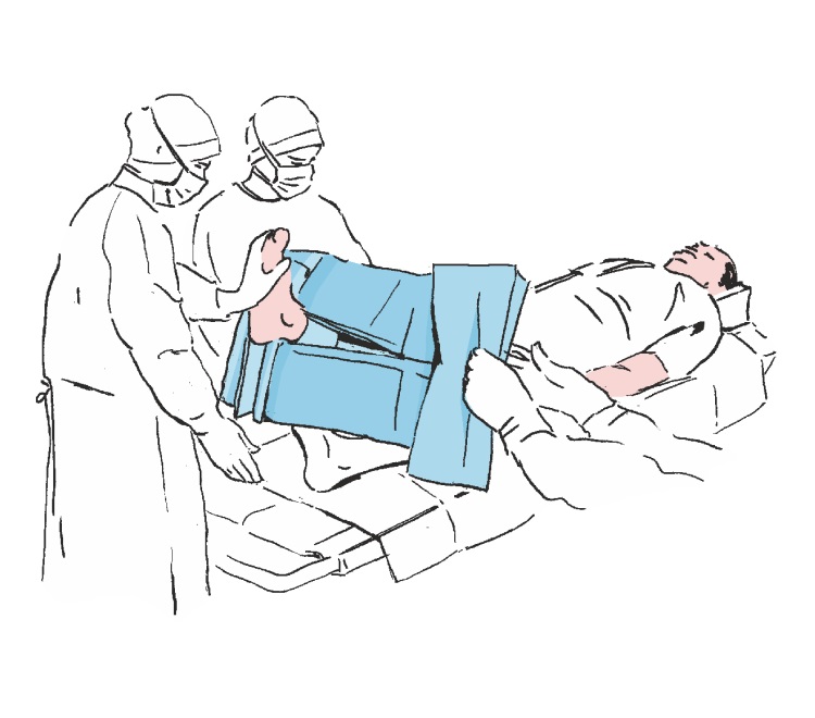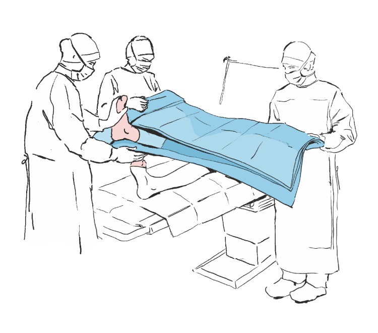 Rozwinąć boki obłożenia tak by swobodnie zwisały ze stołu operacyjnego, a następnie rozwinąć górną część obłożenia w kierunku głowy pacjenta (w kierunku stanowiska anestezjologicznego).
