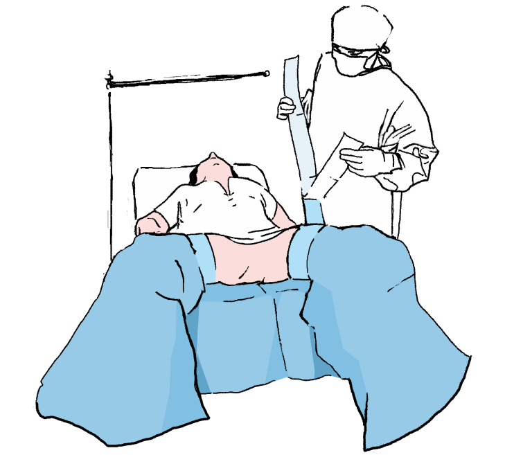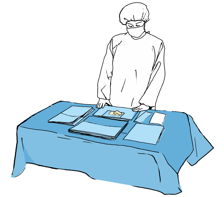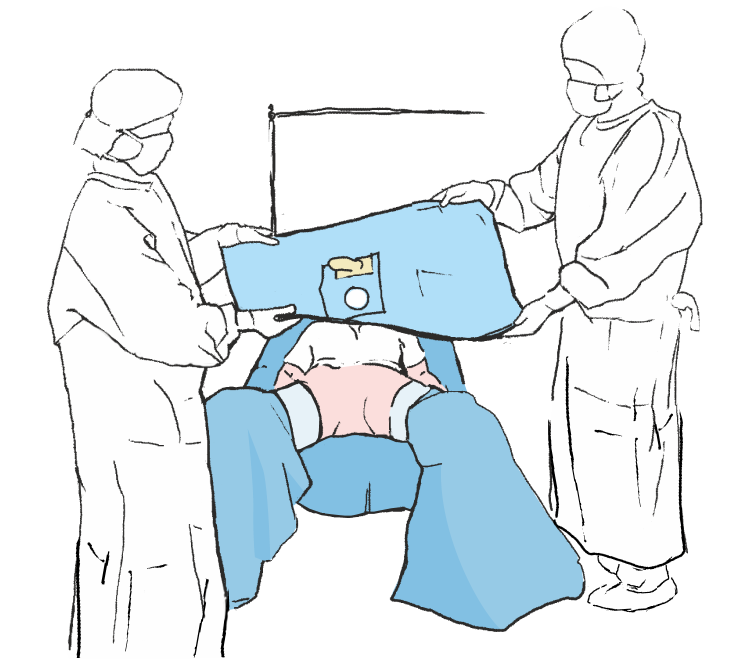 Częściowo rozłożyć serwetę główną na pacjenta (wyznaczania pola operacyjnego) dopasowując otwory w odpowiednie miejsca pola operacyjnego i położyć obłożenie na pacjencie wyznaczając tym samym pole operacyjne.