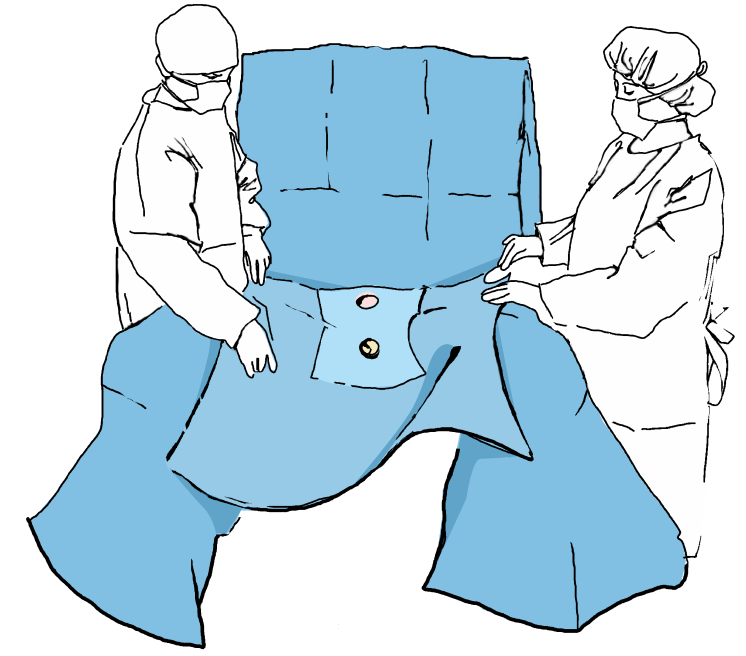 Rozwinąć boki obłożenia tak by swobodnie zwisały ze stołu operacyjnego, a następnie rozwinąć górną część obłożenia w kierunku stanowiska anestezjologicznego. Przełożyć obłożenie przez ramkę, tworząc tym samym ekran anestezjologiczny. Dolną część obłożenia rozwinąć w kierunku dolnego krańca stołu operacyjnego, częściowo między nogami pacjenta.