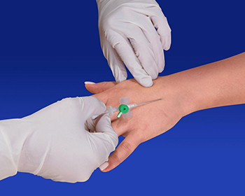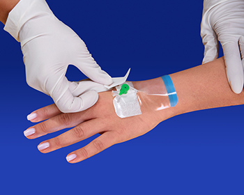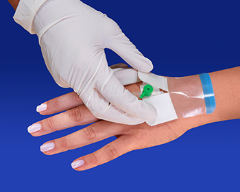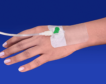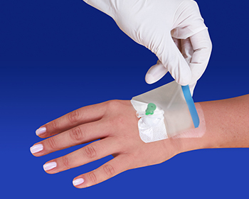 Zdejmij papier zabezpieczający część foliową kaniuli z klejem i umieść na dłoni pacjenta. Rozcięcie między skrzydełkami powinno obejmować stopkę kaniuli.