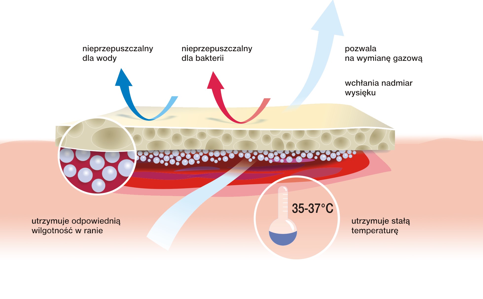 - izoluje ranę termicznie co pozwala utrzymać temperaturę na stałym poziomie i przyspiesza proces gojenia
