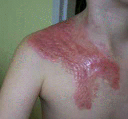 - Stopień IIa – oparzeniu ulega prawie cała warstwa naskórka oraz powierzchowne warstwy skóry właściwej. Rany są zwykle żywoczerwone, bardzo bolesne, a ich cechą charakterystyczną są pęcherze. Urazy oparzeniowe stopnia IIa mogą pozostawiać niewielkie przebarwienia, a czasami nawet blizny.
