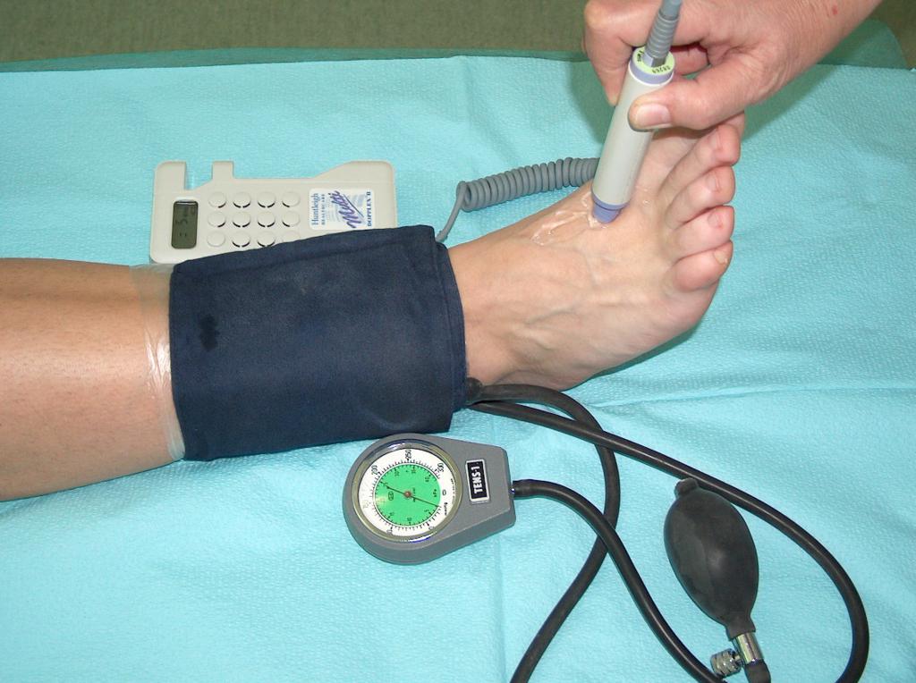 Przed zastosowaniem kompresjoterapii należy bezwzględnie sprawdzić stan krążenia obwodowego. Zastosowanie kompresjoterapii u chorego z upośledzonym przepływem tętniczym może doprowadzić do nasilenia niedokrwienia, martwicy skóry, a nawet amputacji kończyny. Stąd przed zastosowaniem kompresjoterapii konieczne jest wykonanie badania dopplerowskiego i oznaczenie wskaźnika Kostka/Ramię (Fot. 7 ).
