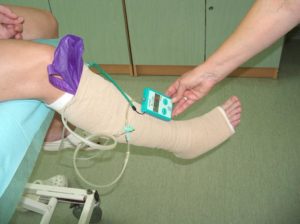 W leczeniu zachowawczym zasadniczą rolę odgrywa kompresjoterapia, polegająca na terapii indywidualnie dobraną siłą za pomocą opatrunków uciskowych. Mogą to być odpowiednio dobrane pod względem stopnia ucisku bandaże (opaski), jak i gotowe wyroby w formie podkolanówek, krótkich i długich pończoch oraz rajstop. Terapia kompresyjna z zastosowaniem bandaży zależy m.in. od materiału z jakiego są one wykonane oraz od sposobu bandażowania kończyny. Zastosowanie kompresji w dużym stopniu zmniejsza nadciśnienie żylne w układzie powierzchownym, poprawia efektywność pompy mięśniowej, zmniejsza zastój żylny i przywraca właściwe warunki hydrostatyczne dla odpływu krwi z naczyń. Kompresjoterapia będzie skuteczna wówczas, jeżeli stopień ucisku będzie aplikowany w zależności od zaawansowania przewlekłej niewydolności żylnej, tzn. zależeć będzie od niewydolności w układzie żył powierzchownych, przeszywających i głębokich. Do określenia ciśnienia międzypowierzchniowego kompresji służy aparat Kikuhime. Przy pomocy tego aparatu zapewniamy wymagane ciśnienie. (Fot. 5)